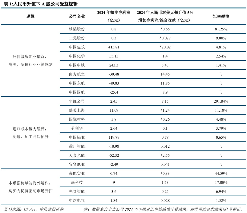 人民币本轮升值周期有望支撑A股走强,核心逻辑有三:一是人民币升值有望提升外资对人民币资产的配置意愿,吸引资金流入A股市场;二是汇率预期的稳定有利于市场风险偏好的提升和A股整体估值中枢的上行,历史上人民币升值阶段A股表现较好;三是人民币升值有利于部分企业盈利的改善,主要逻辑包括:高外币负债、高进口依赖、高出海投资等。因此人民币走强一方面会推动全A指数整体上行,另一方面也会推动外资重仓板块和汇率敏感板块有较好表现。