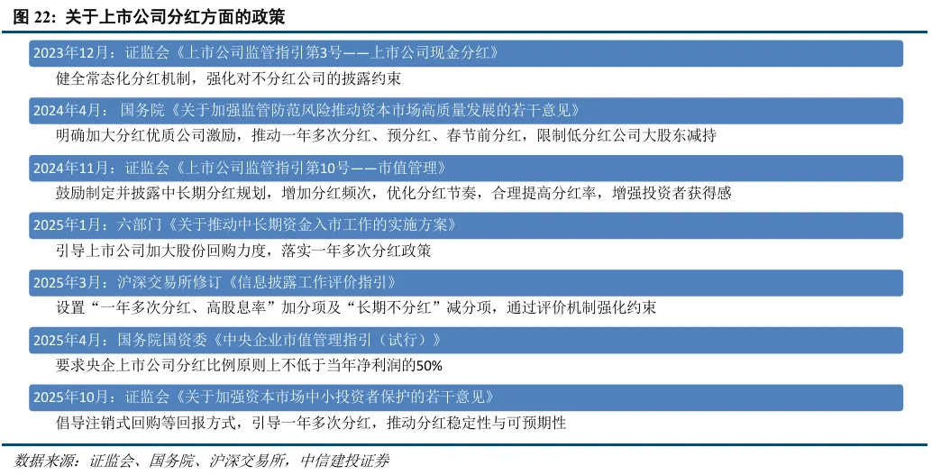 A股整体资金生态正在发生改观,股东回报是大势所趋,通过分红增强投资者信心,并且吸引中长期资金入市。2023年以来,监管政策逐步构建起“强制披露+约束惩戒”的分红监管框架,形成“基础制度+专项指引+市场激励”的分红引导体系,核心方向为强化分红监管硬约束、鼓励现金分红与比例提升。与此同时,政策明确引导上市公司增加分红频次、优化分红节奏,推动中期分红、季度分红常态化,并将分红作为央企市值管理与业绩考核的核心指标。